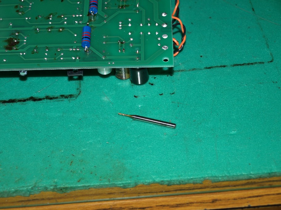 作業中の基板の脇に極細ドリル。
