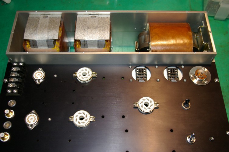 で、写真。電源トランス。特注品ですがパーツの共用化は僕の店でも重要課題。品質を安定させる事とアフターの取り易さの為で有って、コストダウンが第一目標の様などこかのメーカーとは意味が違います。