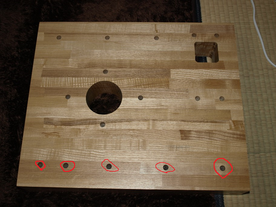 下一列の穴、左右が違っている(大汗)。今迄腕の良い木工屋さんなので安心していた。