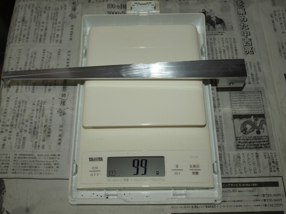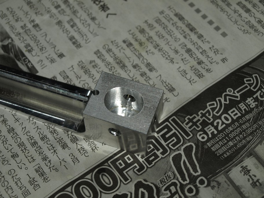 アーム本体のアルミ棒。買って来た状態は回りはギザギザ。僕の指定サイズに鋸で切断ですので仕方が無いのです。