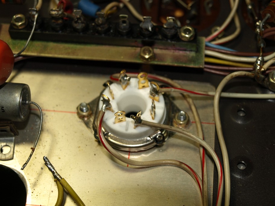 実は整流管ソケットだけを交換して動作チェックしたんですね。此れだけでノイズレベルが減ったんです(笑)。