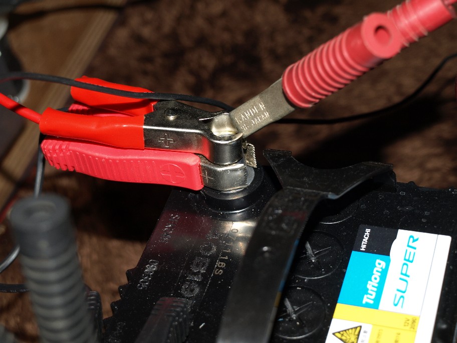 バッテリーの端子、ワニ口クリップが3個も付いている。1個はインバーターへ。