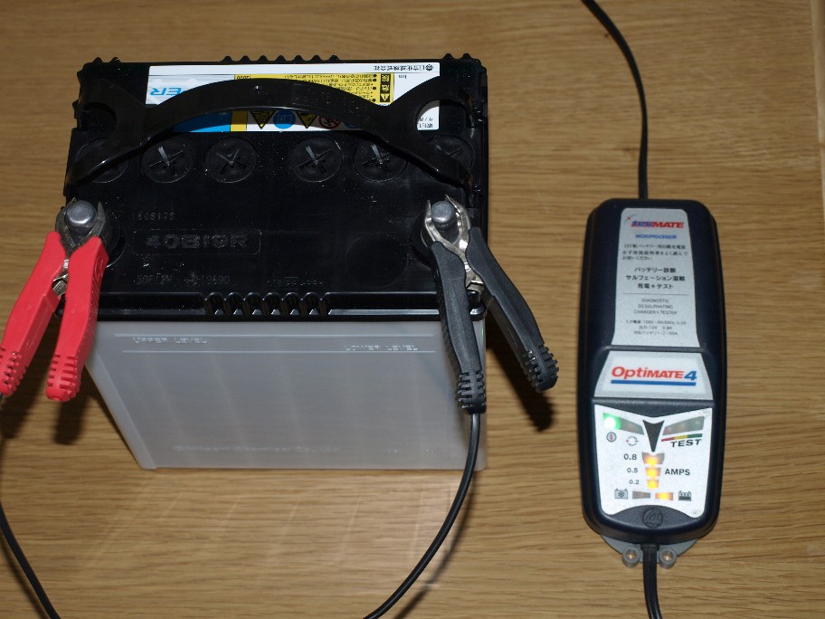 写真の充電器は0,8Aですのでバッチリです。しかも30分毎にバッテリーの状態をチェックしながら充電を続け、満充電に成るとフロート充電に切り替わりますので安心して使えます。