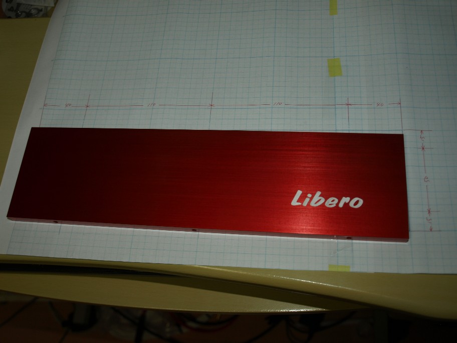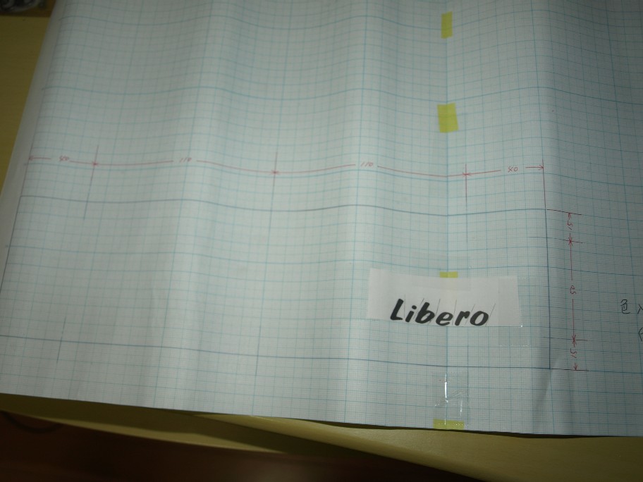 方眼紙へ実物大で書きます。リベロの文字は元図を縮小コピーして(何種類ものサイズを作る)、側板の図面に当てて、一番感じよい文字サイズをこの辺かな?と言う所へ接着。
