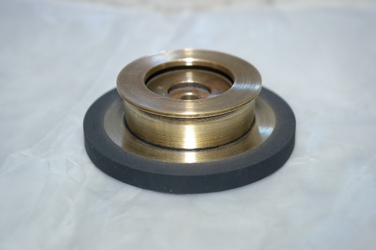 注文を受けました、アイドラーのゴムの張り替え。今回のは、ゴム屋さんもかなり苦労した様子。かなり以前のターンテーブルでアイドラーとベルトを併用しているメカニズムです。アイドラーのゴムの張り替えは、まずゴムを焼きつけ、その焼きつけたゴムを研磨機で真円に仕上げます。焼きつけの時にそれなりの温度に上がります。結果表面に焼け跡が出来てしまい、更に研磨の時チャックに咥えるので、咥え痕が付いてしまいます。一般には精度に問題の起きない所を咥えての加工なのですが、今回のアイドラーにはその咥え代が殆ど有りません。基本的にゴム屋さんの職人はオーディオには詳しくありません。結果重要な所に咥え痕が残ったり焼け跡の位置が悪く精度が悪くなったり・・。