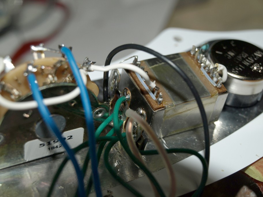 ノイズレスは普通のシングルコイルと同じ、あの硬い配線材。