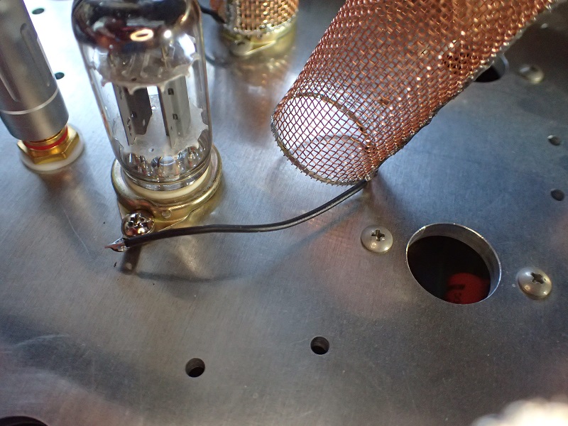 真空管ソケット取り付けビスの片側を外し、卵ラグを取り付け。