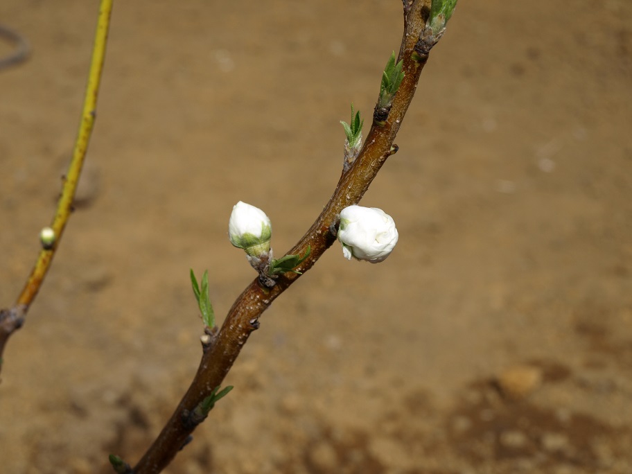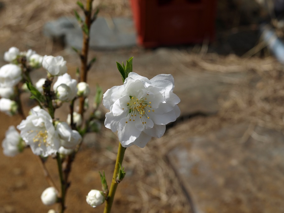 何周かして目に留まったのが桃ノ木。普段桃の花と言うと濃いピンクを想像しますが、何と真っ白、しかも白さと花の形に一目ぼれ。
