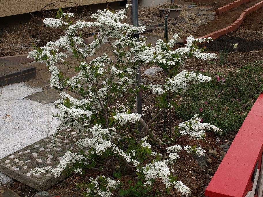 ふと目をやると玄関入り口の雪柳が・・・。