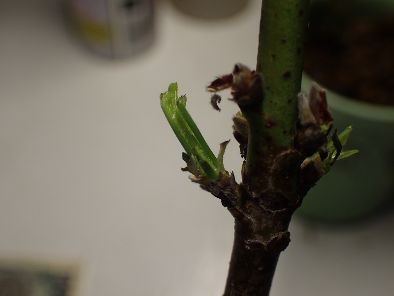 挿して1週間経って居ないのに新しい芽を吹きだしました(水揚げが上手く行っているみたい)。