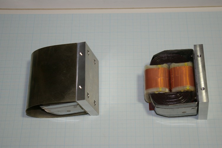 今までは、写真左のパーマロイ板を巻きつけていました(写真では1枚ですが実際には交差する形で二枚巻いています)。