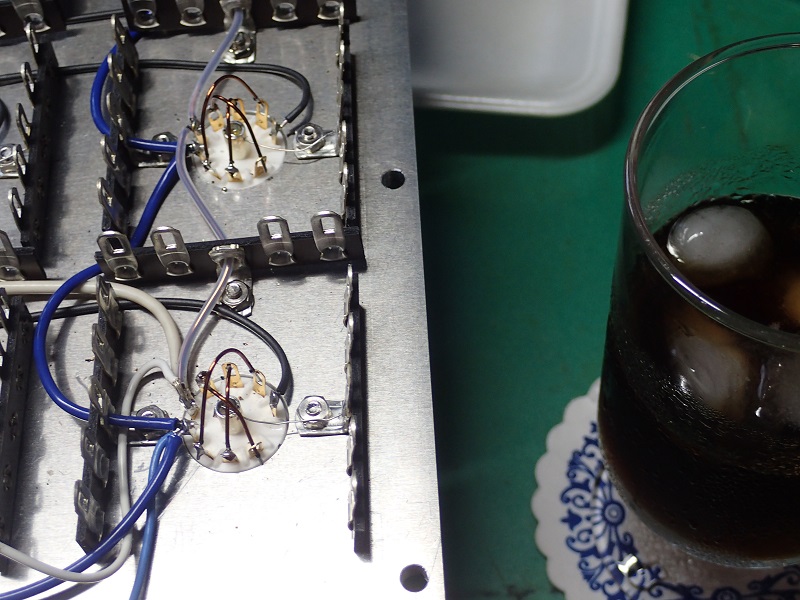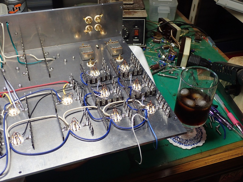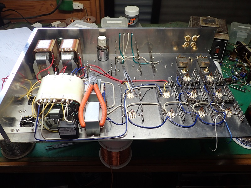 今回は、シャシの確認で一旦取り付けましたが、判っているアンプは天板だけで出来る範囲の配線を完了させます。側板の無い方が作業をし易いのですね。