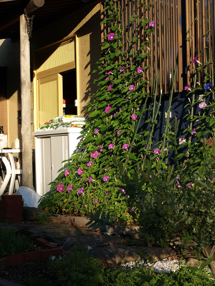 朝顔の左後ろの白いBOX。ガーデニング用品を入れる為に新しく設置。