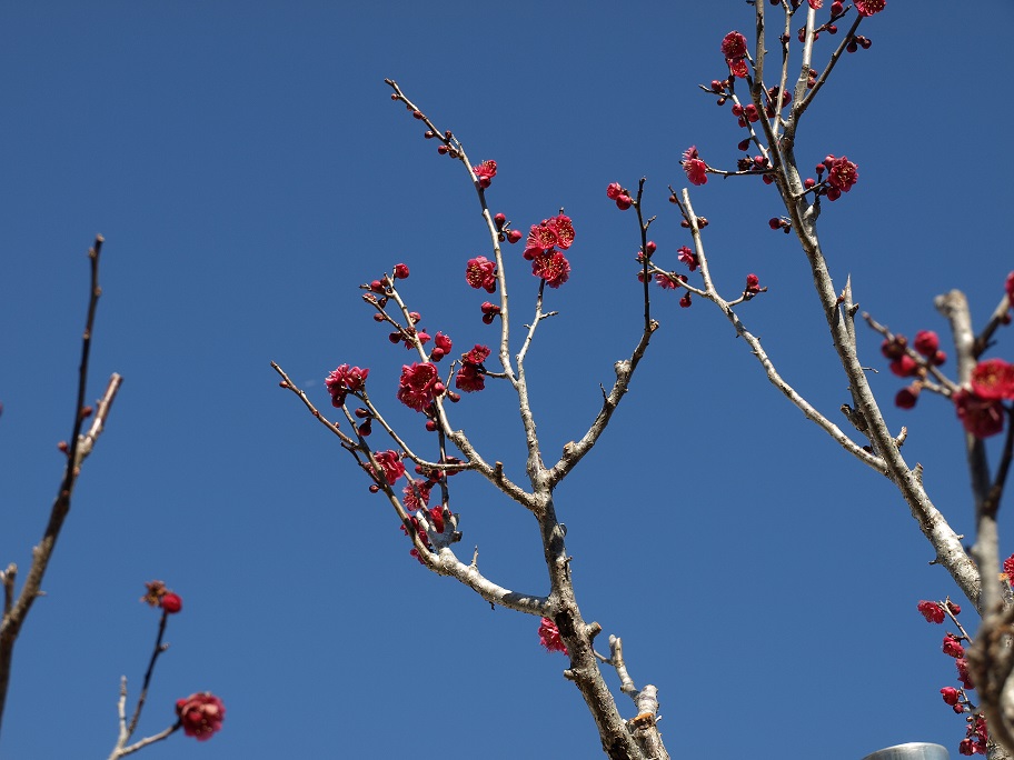 紅梅が三分咲き。
