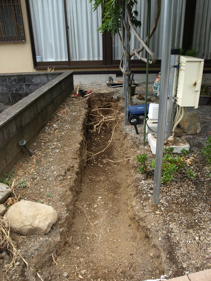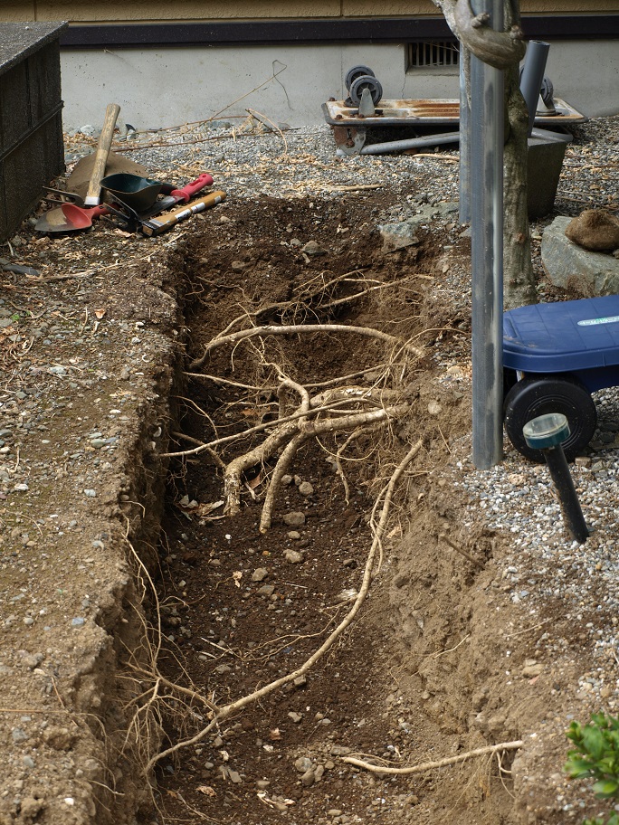 溝のすぐ脇に藤が植えて有りますので、この根っこ。切る訳には行かないので、無茶苦茶邪魔をされました。
