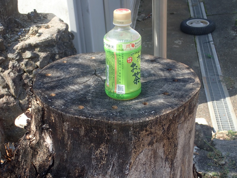 昨日、10mmの穴(深さは10cm以上)を切り株へ12個開けました。