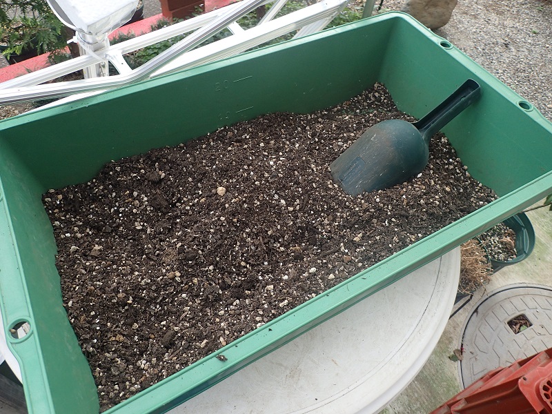鉢へ入れる土を攪拌します。要は売っている培養土1種類だけではダメと気付いたピンキー君。5種類以上の材料を混ぜて、植える植物に合った土を作るのです。