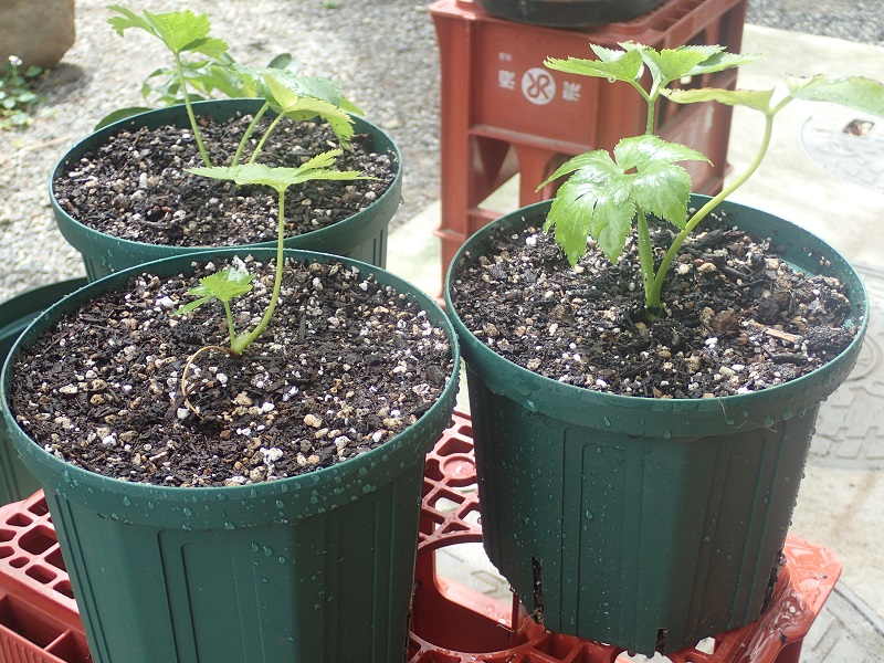 今回は6号鉢へ植えました(号数×3cmが直径です)。明日葉はかなり大きく成るので本来は8号以上を欲しがります。