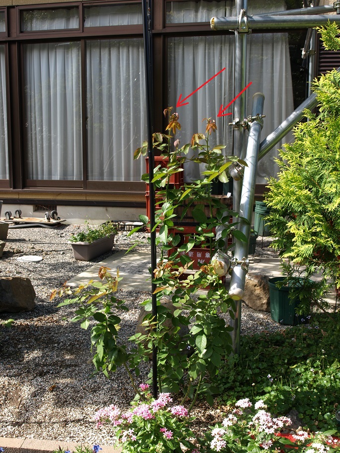 7月の頭に植え付けたバラの苗木(ツルバラです)。