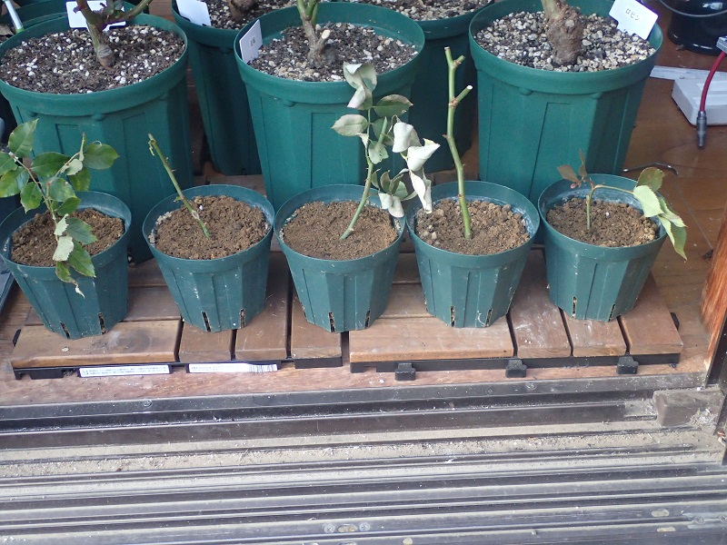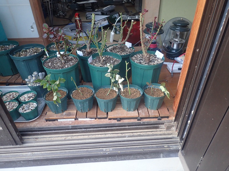 去年の12月に入って来たバラ苗5株(大き目の鉢です)の前に小さな鉢に植えて有る小さな株。