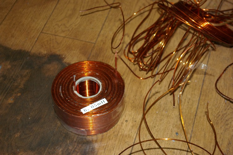 大型空芯コイル。今回の変更ではインダクタンスが少ない方向です。と言う事で、今まで使っていたコイルを解き、今回必要な値に調整しました。