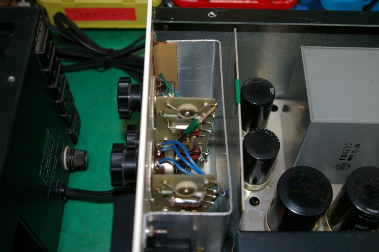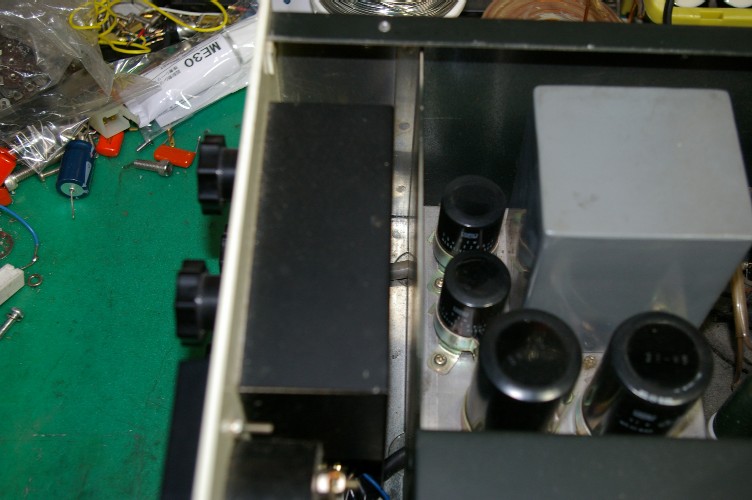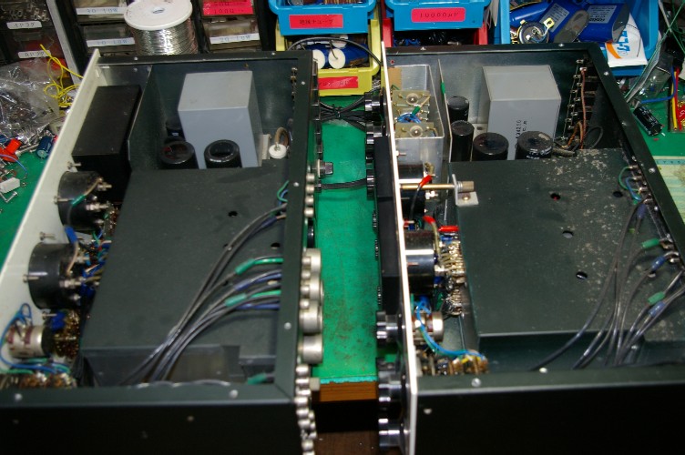左のアンプ。底板にトランスが付いています。メーターとのマッチングトランスです。