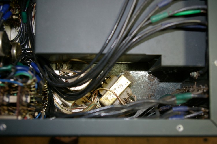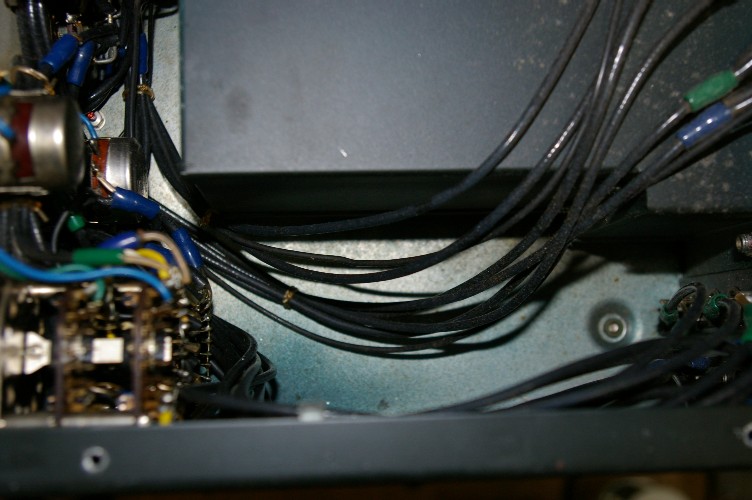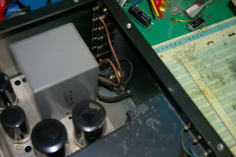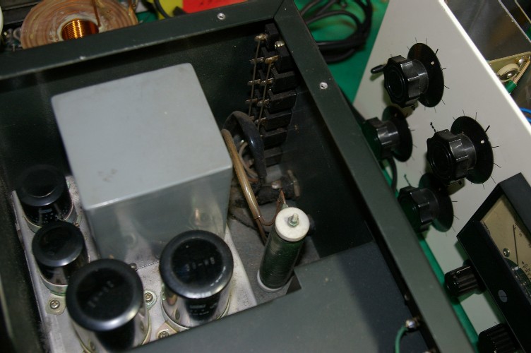 右の電源部。左に有った大型のホーロー抵抗が有りません。また配線材も絹巻き線ですので時代を感じます。