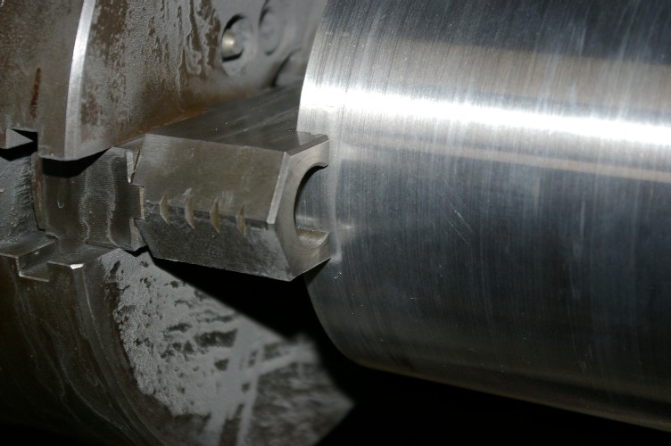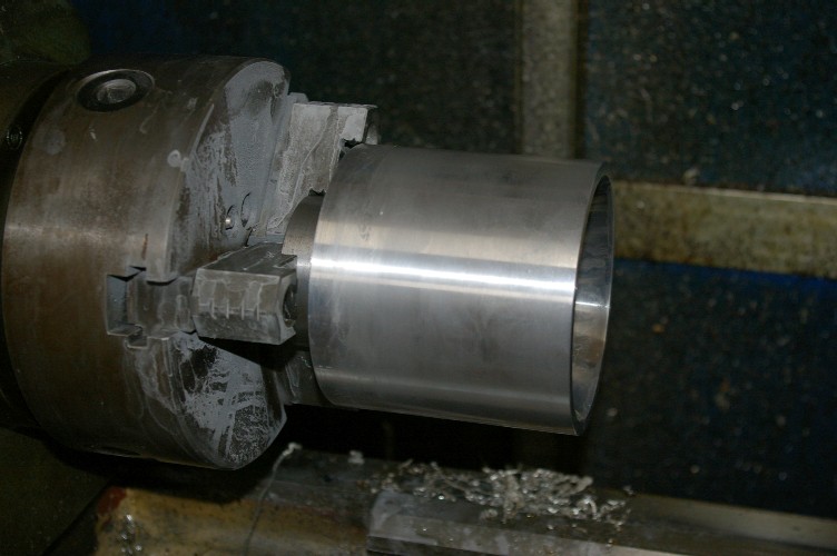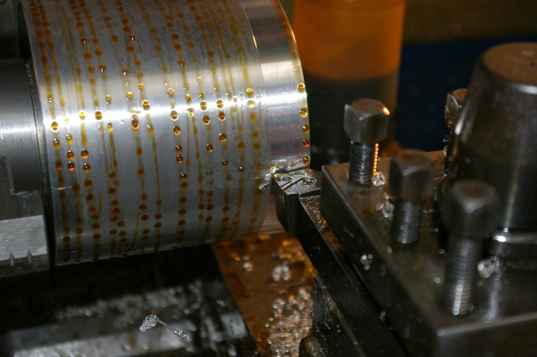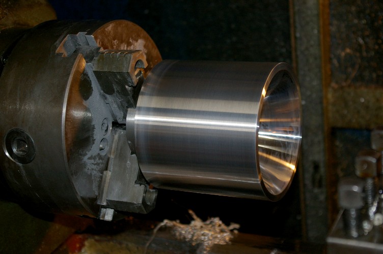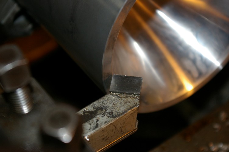 ホーンのカーブを作る為に、材料はこの様に旋盤のチャックに銜えられています。