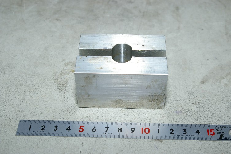 アルミブロックは1/100mm単位の精度で切削して有ります。このブロックにシャフトをはさみ、位置出しをして有る精密バイス(万力)に挟むとシャフトの位置が固定されます。