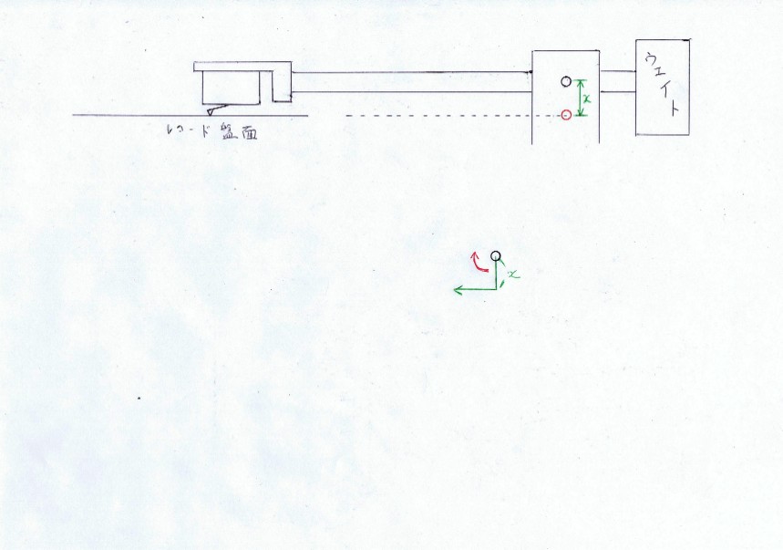 下の力の関係図。レコードが回転するとアームは図面左方向に引かれます。