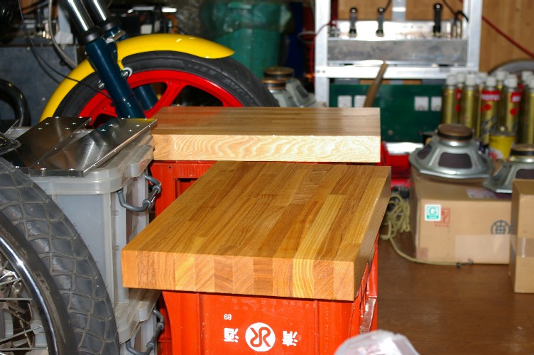 店内で威張っている、塗装中の集成材。タモの50mm厚の板です。