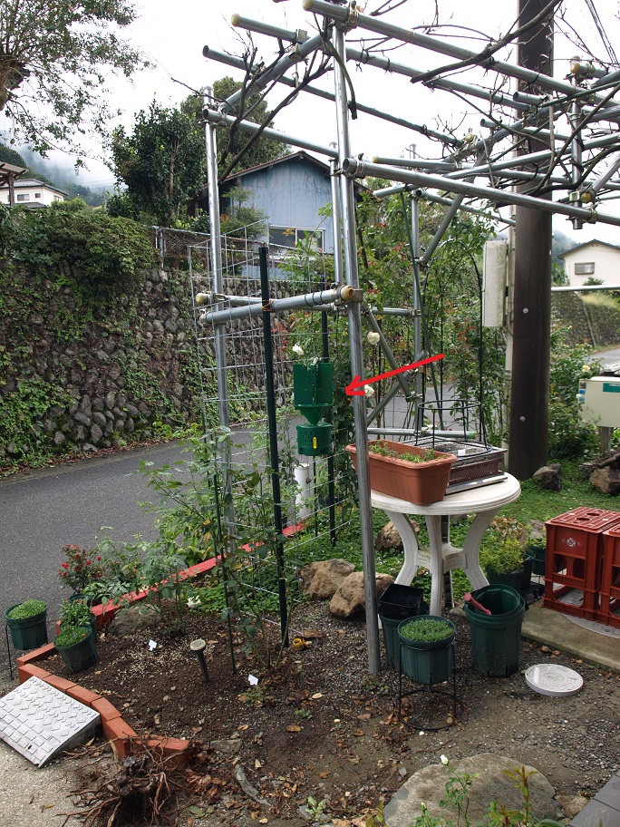 チョット斜めに成っていますが(後ろ側に傾いている)平気です。バラが自分から修正します。