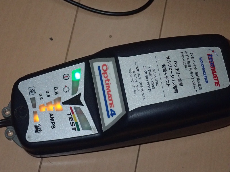 昨夜、日立バッテリーへオプチメイトを繋いで充電開始。